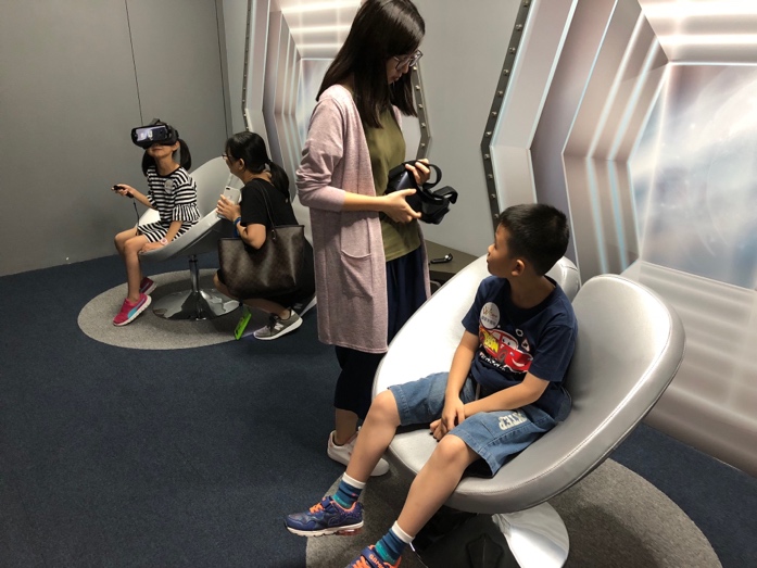 關愛咭會員正與其子女一起使用展館內的創新多媒體設備。