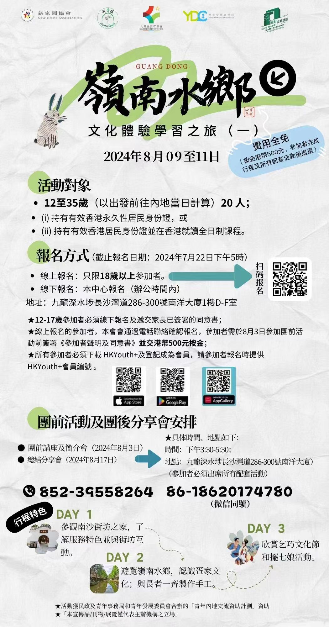 2024年8月9-11日三天两夜的岭南水乡文化学习体验之旅圆满结束。活动吸引20位青少年参加,并让青少年亲身感受岭南水乡特色文化、七夕节习俗、...
